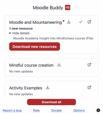 Moodle Buddy is een handige browserextensie voor Firefox die speciaal is ontworpen voor studenten en docenten die gebruik maken van Moodle. Deze tool stelt gebruikers in staat om snel en eenvoudig alle beschikbare cursusmaterialen, zoals PDF-documenten, met één klik te downloaden. Naast het verzamelen van bestanden, scant de extensie ook op updates in cursussen, waardoor gebruikers onmiddellijk op de hoogte zijn van nieuwe bronnen en activiteiten. Dit bespaart aanzienlijk tijd en moeite in vergelijking met het handmatig downloaden van bestanden.